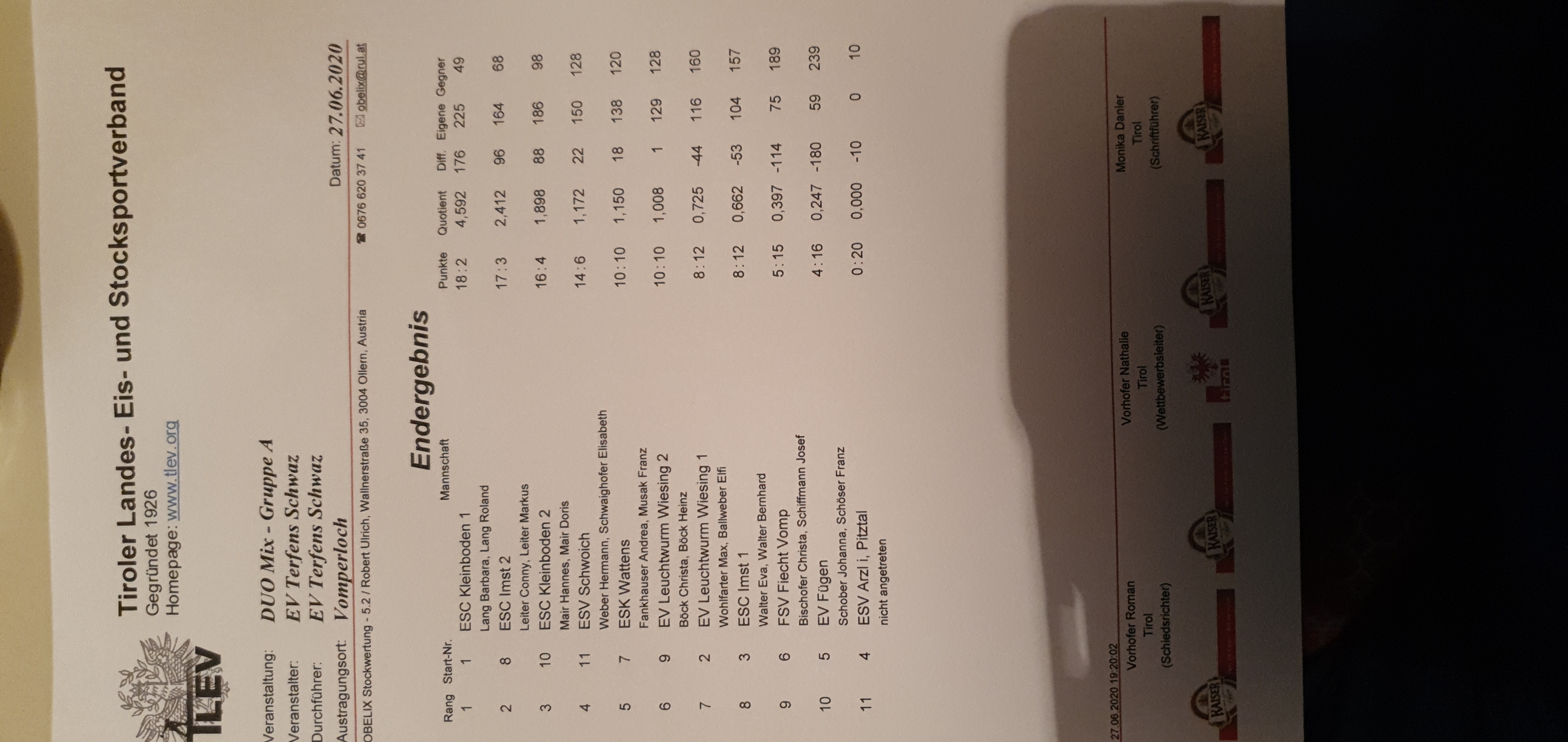| Sa 27.06.2020 | EV Terfens Schwaz | DUO Mix | 2;8 | Link | Link |